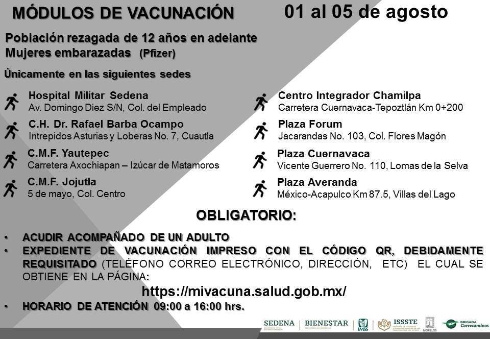 Con el objetivo de continuar con el Plan Nacional de Vacunación contra COVID-19 en Morelos, a partir del lunes 1° de agosto continúa en Morelos la vacunación en la población rezagada de 12 años en adelante con el biológico Pfizer, informa la Brigada Correcaminos en el estado.