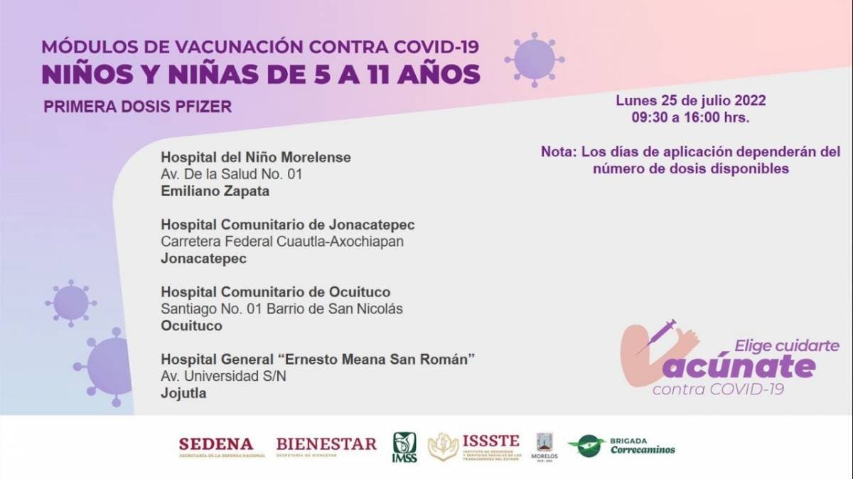 La Secretaría de Salud, a través de Servicios de Salud de Morelos (SSM), dio a conocer que el lunes 25 de julio se inoculará sólo primeras dosis Pfizer a los menores de cinco a 11 años, y los días de aplicación dependerán del número de dosis disponibles; el horario será de 09:30 a 16:00 horas.