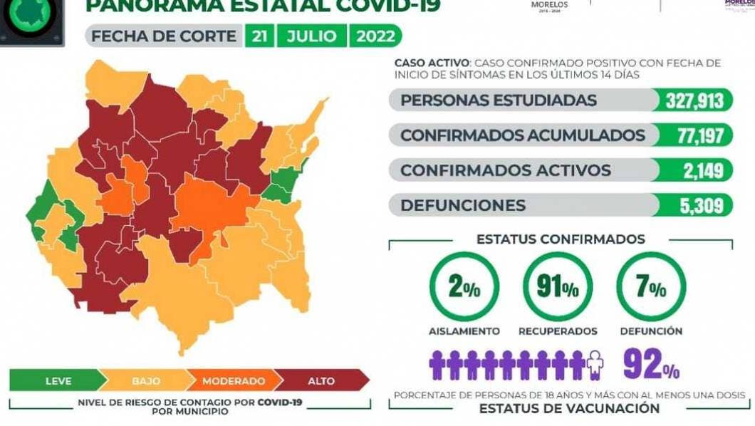 La Secretaría de Salud informa que a la fecha en Morelos se han estudiado 327 mil 913 personas, de las cuales se han confirmado 77 mil 197 con coronavirus COVID-19; 2 mil 149 están activas y se han registrado 5 mil 309 defunciones.