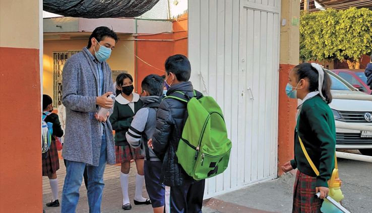 Nueva normalidad. En el ingreso de los menores a la escuela se les aplicaba gel desinfectante y se verificaba el uso del cubrebocas.