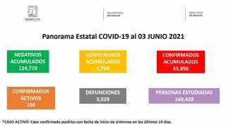 La Secretaría de Salud informa que a la fecha en Morelos se han estudiado 160 mil 428 personas, de las cuales se han confirmado 33 mil 850 con coronavirus COVID-19; 104 están activas, descartado 124 mil779 y están como sospechosos mil 799; se han registrado 3 mil 529 defunciones.