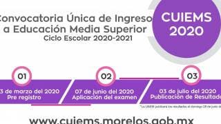 La Secretaría de Educación del estado de Morelos, a través de la Dirección General de Educación Media Superior y Superior, convoca a todos los alumnos al proceso de ingreso a Educación Media Superior 2020. En dicha convocatoria podrán participar estudiantes que se encuentran cursando el tercer año de secundaria y/o egresados de Educación Secundaria. Dicho proceso comienza el lunes 10 de febrero, se debe ingresar al portal: www.cuiems.morelos.gob.mx