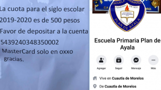 Gente sin escrúpulos pretendió engañar a padres de familia de la escuela primaria Plan de Ayala, del municipio de Cuautla, solicitándoles depositar una cantidad por concepto de cuota escolar. Lo anterior fue evidenciado por el mismo plantel en su cuenta de Facebook. “ATENTO AVISO!!!!