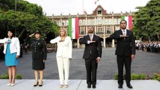 El secretario de Administración, Fernando Solís, encabezó la ceremonia realizada ayer de los honores a la Bandera en la Plaza de Armas. Lo acompaña la diputada Edith Beltrán Carrillo.Foto: Maya Ocampo/ DDM