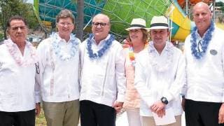 Reunidos para la foto tras la inauguración el delegado del IMSS enMorelos, Víctor Manuel Vázquez; el secretario de Turismo, Enrique de la Madrid; el Gobernador Graco Ramírez, la presidenta del DIF, Elena Cepeda, el director general del IMSS, Mikel Arriola y el CEO de la empresa de entretenimiento, John Duffey.