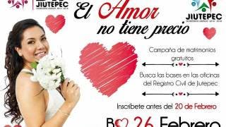 El DIF municipal y el Registro Civil del Municipio de Jiutepec, anuncian por la segundo año consecutivo, la campaña de matrimonios gratuitos. Con el fin de dar certeza juridica a todas las parejas del municipio, las autoridades anunciaron la campaña de matrimonios gratuitos de 2017 El amor no tiene precio.Todas las parejas interesadas, deberán registrarse en cualquier sede del Registro Civil antes del 20 de febrero de 2017, presentar todos los documentos y requisitos para que el 26 de febrero se lleve a cabo la boda colectiva en el Zócalo de Jiutepec.