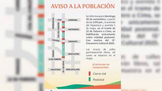 El Ayuntamiento de Tepoztlán anunció que este domingo 30 de noviembre, a partir de las 2:00 p.m., la Avenida del Tepozteco y la Avenida 5 de Mayo (en el tramo de 22 de Febrero a Cima) serán habilitadas exclusivamente como vialidad peatonal. Esta medida se toma para garantizar un evento seguro y ordenado con motivo del 15º Encuentro Cultural 2025. Se informó a la ciudainvitación danía y visitantes que los cruces de calles permanecerán libres, y se agradece la comprensión y colaboración para el desarrollo del evento.