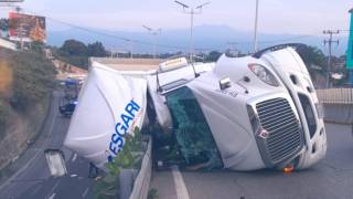 Un tráiler de una empresa de transporte de mercancía volcó sobre su lado derecho al circular sobre el paso a desnivel del Polvorín (carril norte sur). El camión quedó sobre la barra de protección provocando el cierre de la vía por horas El hecho quedó captado en un video que fue difundido en redes sociales, donde se aprecia al tráiler circular a toda velocidad rumbo al sur, terminando su loca carrera sobre el distribuidor. La unidad estuvo a punto de caer, lo que pudo haber causado un percance mayor. el tránsito ha sido colapsado por más de 10 horas
