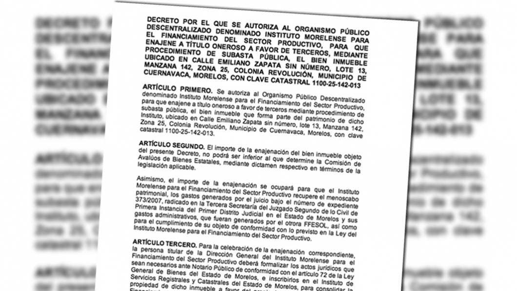 El jefe del Ejecutivo, Graco Ramírez, solicitó el año pasado, autorizar al Instituto Morelense para el Financiamiento del Sector Productivo que enajene a título oneroso a favor de terceros mediante procedimiento de subasta pública, dos bienes inmuebles, los cuales fueron dados en prenda para la obtención de un crédito, para recuperar el adeudo que se otorgó a los propietarios, mediante financiamiento por 60 mil pesos, cada uno.