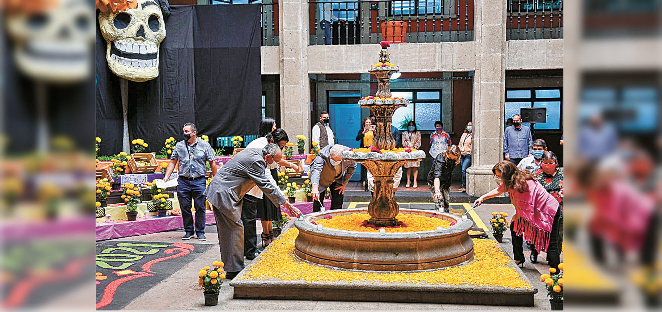 El jefe de la Oficina de la Gubernatura, José Manuel Sanz Rivera; Leticia Nolasco Ortigoza, encargada de despacho de la Secretaría de Obras Públicas; Luis Arturo Cornejo, secretario de Educación, y Julieta Goldzweig Cornejo, secretaria de Turismo y Cultura, realizaron el encendido de las velas que iluminan la ofrenda.