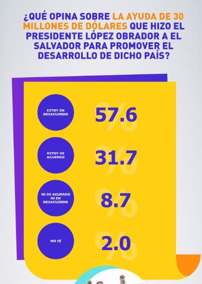 Informó que el 57.6 por ciento de mexicanos no estuvo de acuerdo en la ayuda de 30 millones de dólares que hizo AMLO a El Salvador para promover el desarrollo de dicho país.