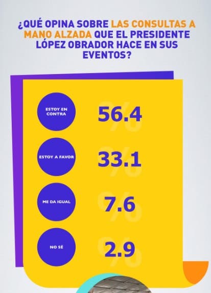 Mencionó que según la encuesta, el 56.4 por ciento de los mexicanos está en contra de las consultas a mano alzada que AMLO hace en sus eventos; sólo el 33.1 por ciento se encuentra a favor.
