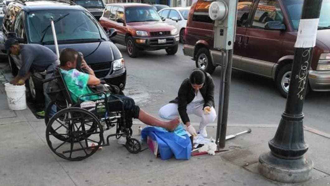 En redes sociales se hizo viral la fotografía de una enfermera curando las heridas a un hombre en situación de calle que se encuentra en una silla de ruedas.