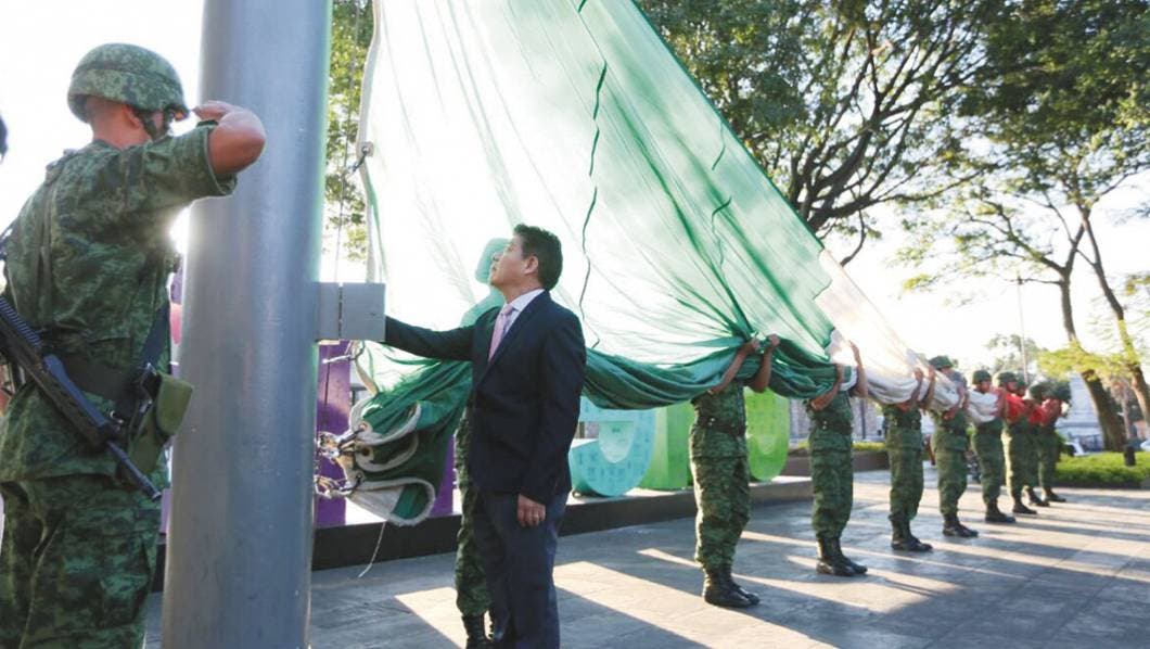 Ayer, en la explanada de la Plaza de Armas, para conmemorar los 100 años de la creación de la Constitución Política se reunieron representantes de los tres Poderes de Gobierno, encabezados por Matías Quiroz Medina, secretario de Gobierno; María del Carmen Verónica Cuevas López, magistrada presidenta del Tribunal Superior de Justicia y Julio Yáñez Moreno, representando al Congreso.