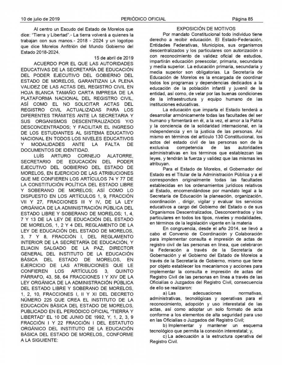 Fue publicado en el Periódico Oficial “Tierra y Libertad” el acuerdo por el que las autoridades de la Secretaría de Educación de Morelos garantiza la validez de las actas del Registro Civil en hoja blanca, así como el no solicitar actas actualizadas para los diferentes trámites ante la dependencia u organismos descentralizados y/o desconcentrados.
