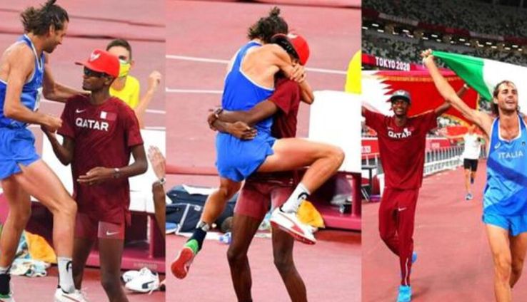 Tamberi (Italia) y Barshim (Qatar), terminaron empatados en la prueba de #SaltoDeAltura; podían hacer un salto de desempate pero ambos decidieron llevarse el oro cada uno.