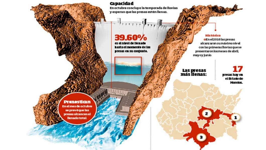 Asimismo, en Ayala también son tres presas las que se encuentran, la “General Francisco Leyva” (Chinameca), que lleva un 61% de nivel; “El Gigante”, con 85% de su capacidad; y la “Tlayecac”, que registra un 40.93%.