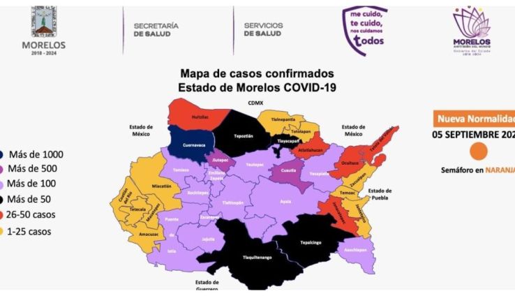 Precisó que los casos confirmados se encuentran distribuidos de la siguiente manera, Cuernavaca, mil 356; Cuautla, 841; Jiutepec, 526; Ayala, 269; Jojutla, 221; Temixco, 207; Zacatepec, 184; Yautepec, 181; Emiliano Zapata, 177; Xochitepec, 152; Tlaltizapán, 123; Axochiapan, 118; Puente de Ixtla y Yecapixtla, 115; Xoxocotla, 100; Tlayacapan, 82; Tepoztlán, 80; Tlaquiltenango, 79; Tepalcingo, 65; Jonacatepec, 43; Ocuituco, 36; Atlatlahucan, 34; Huitzilac, 30; Tetela del Volcán, 28; Miacatlán, 24; Totolapan y Amacuzac, 22; Tlalnepantla, 19; Coatlán del Río y Jantetelco, 17; Mazatepec, 16; Tetecala y Temoac, 13; Zacualpan de Amilpas, 12; Coatetelco, 10; Hueyapan, 1; otros estados, 111.