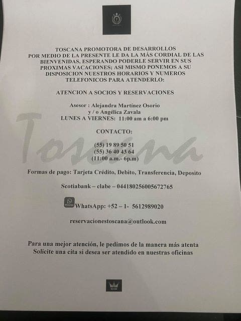 "Esto fue en el salón que tienen en ese hotel para eventos, había mucha gente y me di cuenta que era una empresa fantasma que se llama Toscana; desafortunadamente perdí una cantidad fuerte de dinero, donde me ofrecían viajes a largo plazo, hoteles y descuentos",comenta la joven a Diario de Morelos.
