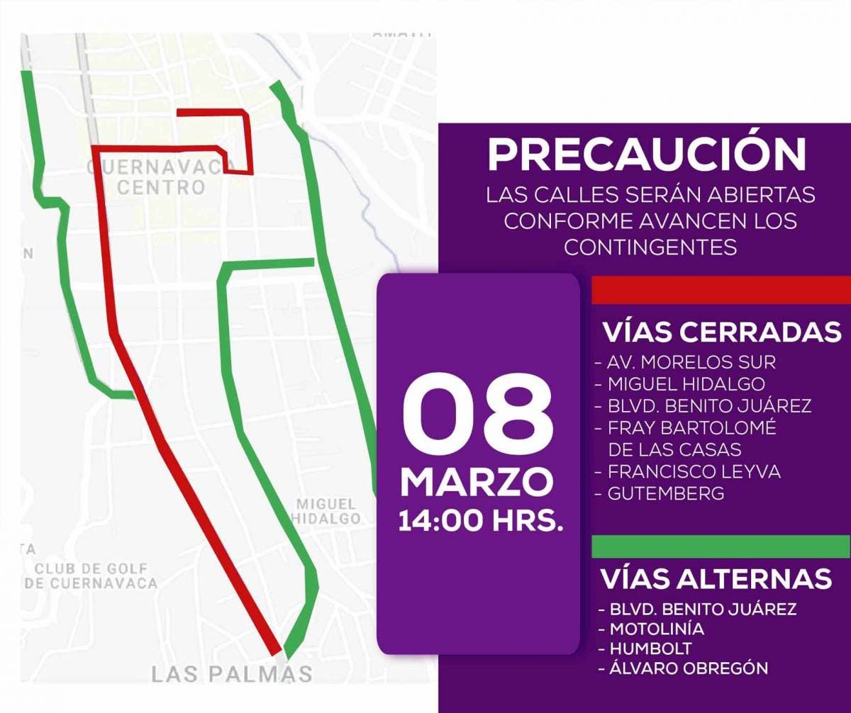La marcha iniciará a las 14:00 horas de este viernes 8 de marzo, iniciando en la glorieta del Niño Artillero, para subir por la avenida Morelos, luego doblar en calle Miguel Hidalgo, luego Gutemberg, para acceder finalmente a la plaza de Armas.