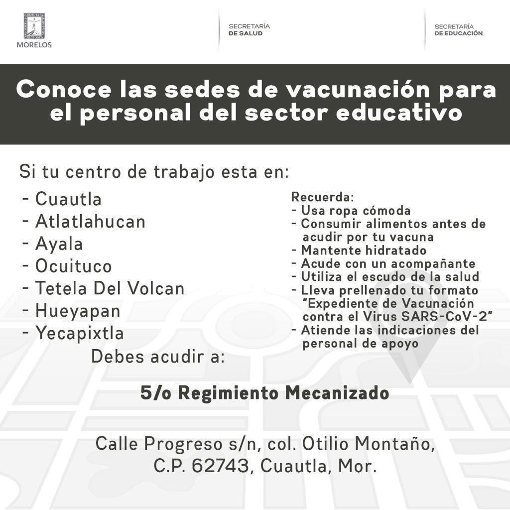El 5to. Regimiento Mecanizado, ubicado en calle Progreso s/n, colonia Otilio Montaño en Cuautla, será el módulo de vacunación para las y los profesores que su centro de trabajo sea en Cuautla, Atlatlahucan, Ayala, Ocuituco, Tetela Del Volcán, Hueyapan y Yecapixtla.