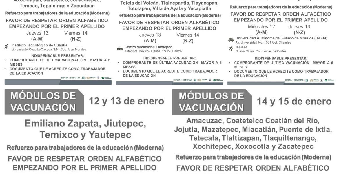 El viernes 14 de enero se realizará la vacunación en el Instituto Tecnológico de Zacatepec para apellidos de la A la M, de los maestros que vivan en Amacuzac, Coatlán del Río, Mazatepec, Miacatlán, Puente de Ixtla, Coatetelco, Xoxocotla, Tetecala, Xochitepec, Zacatepec, Jojutla, Tlaltizapan y Tlaquiltenango, al día siguiente para los apellidos de la N a la Z.