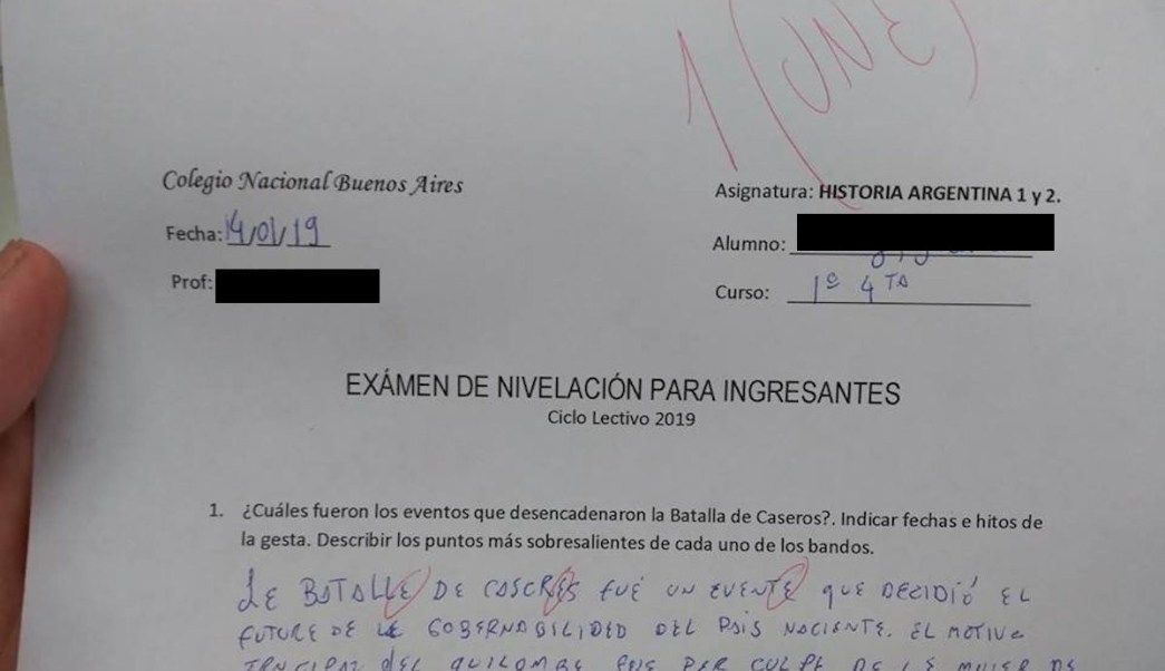 “Le Batalle de Caseres que decidió el future de la gobernabilided del país naciente. El motive principal del quilombe fue por culpe de le mujer de Urquiza que no le cabía les mandatos patriarcales de Juan Manuel de Roses…”, se lee en el examen.