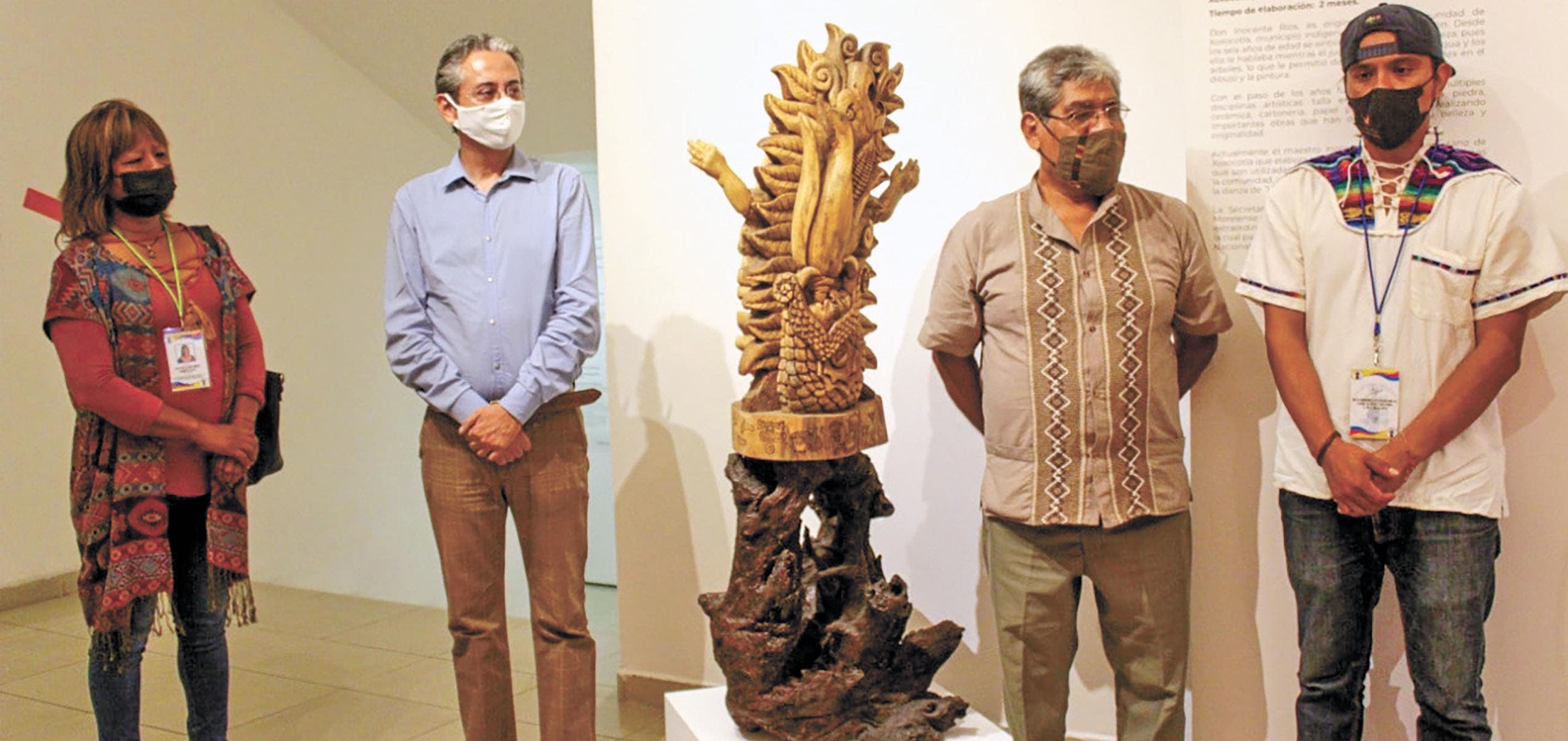 Se trata de una escultura realizada por Inocente Ríos Ponciano, del municipio indígena de Xoxocotla, quien durante dos meses trabajó en darle forma a esta espectacular figura tallada en madera de Tzompantle con dos vistas, obra que participó en la XLVI Edición del Concurso Gran Premio Nacional de Arte Popular 2021.