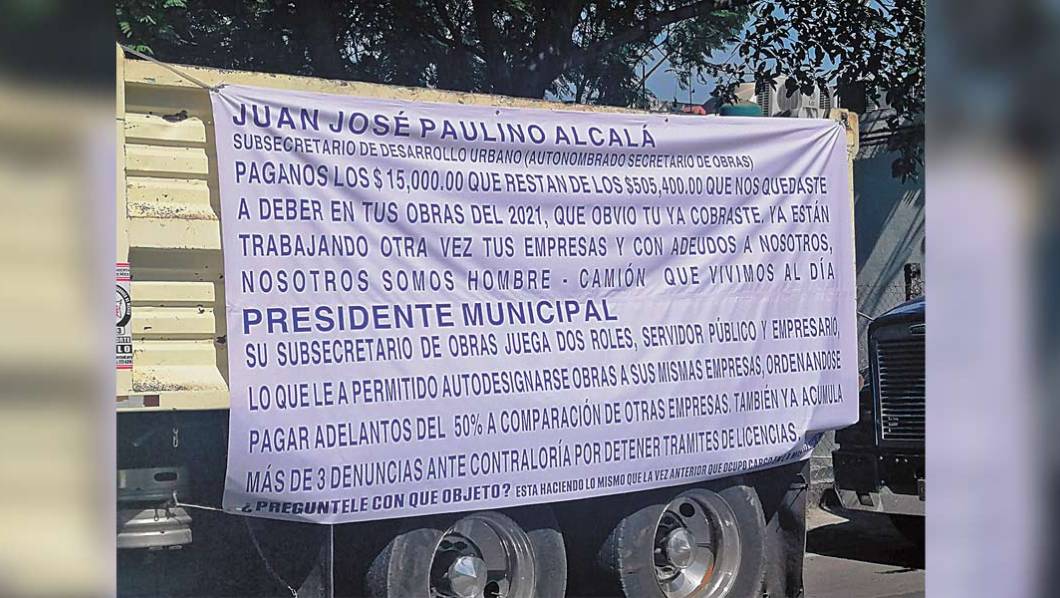En una de las mantas que colocaron en sus camiones tipo tortón, mostraron una manta que acusa al funcionario, “Juan José Paulino Alcalá, subsecretario Desarrollo Urbano páganos los 15 mil pesos que restan de los 505 400 mil que nos quedaste a deber en tus obras de 2021, que obvio ya cobraste; nosotros somos hombres de camión que vivimos al día. Presidente Municipal, el subsecretario juega dos roles”, dice la manta.