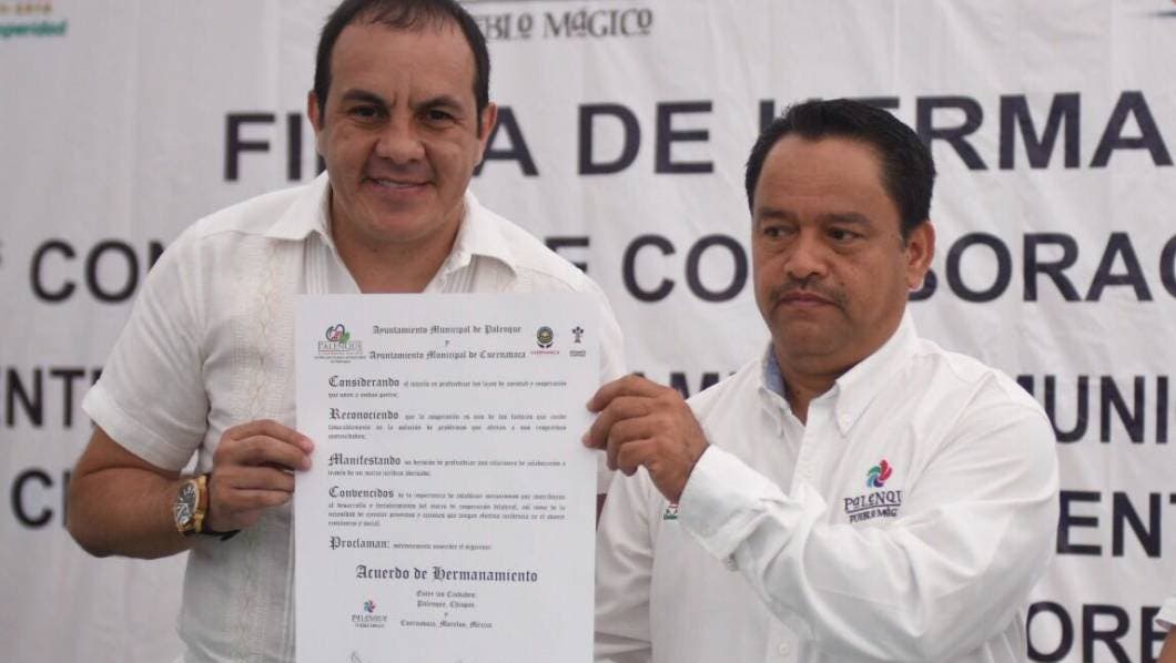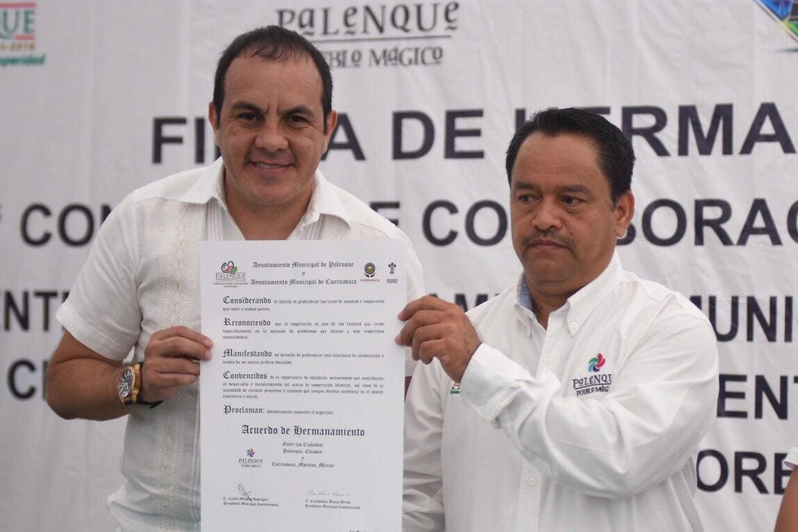 Con el propósito de fortalecer rubros como el turismo, la economía, y el intercambio cultural y social, el alcalde ciudadano Cuauhtémoc Blanco Bravo, firmó un convenio de colaboración y de hermanamiento entre la ciudad de Cuernavaca y Palenque, Chiapas, en compañía de su homólogo Carlos Morelos Rodríguez.