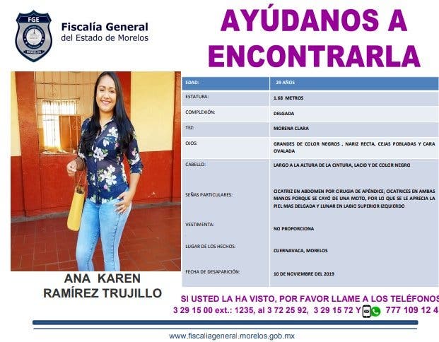 La joven originaria de Cuernavaca es mamá de una niña, mide aproximadamente 1.70, cabello negro largo, tiene una cicatriz en la apéndice, una en la nuca y una en su mano, así como lunar en su labio, y es de piel morena.