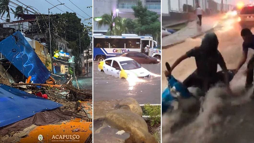 Por medio de redes sociales se dieron a conocer varios videos donde se muestra los grandes ríos de agua correr sobre la costera y varios sitios de Acapulco, calles inundadas, vehiculos inundados y llevados por la fuerza del agua, así como los deslaves que provocó en algunas propiedades.