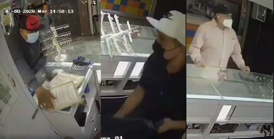 En él se aprecia a un hombre que se acerca a 2 vendedoras y las encañona, mientras otro cómplice se trepa al mostrados para vaciar la mercancía.