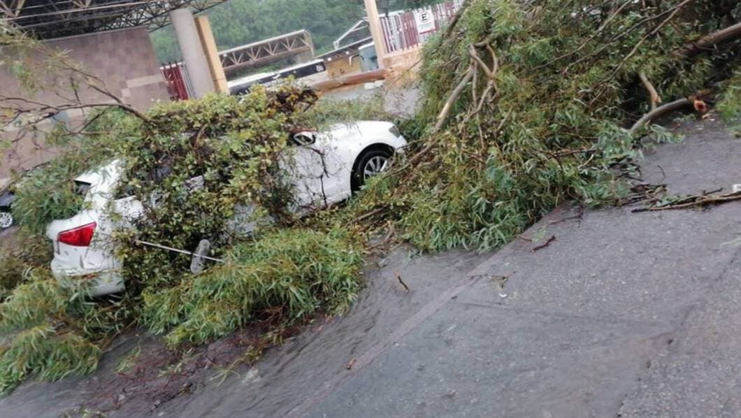 Otro árbol más cayó en la avenida Vicente Guerrero, esquina Nueva Italia, sobre una camioneta.
