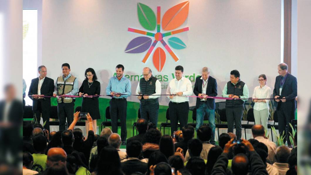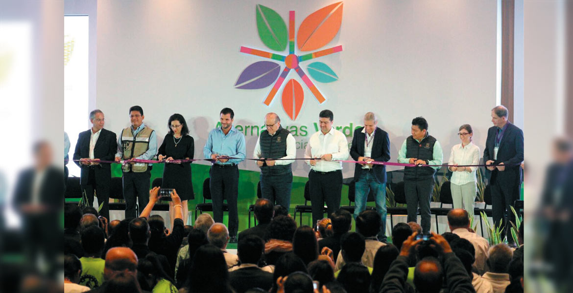 Inicio. El Gobernador Graco Ramírez, el titular de la Semarnat, Rafael Pacchiano; Topiltzin Contreras, de la SDS, Brenda Valderrama de la SICyT e invitados de diferentes países, durante la puesta en marcha de la cuarta edición de Alternativas Verdes, en el WTC de Xochitepec.