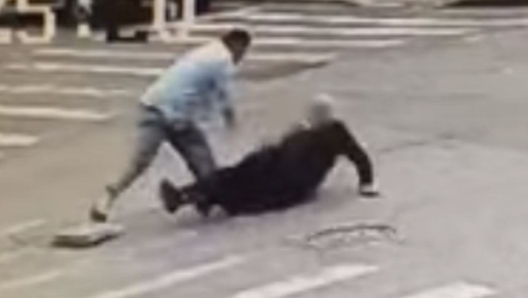 Momentos más tarde, el judío es sometido en el suelo y golpeado por el agresor, quien además le patea la cabeza y espalda. Cuando la víctima intenta levantarse, el hombre vuelve a derribarlo.
