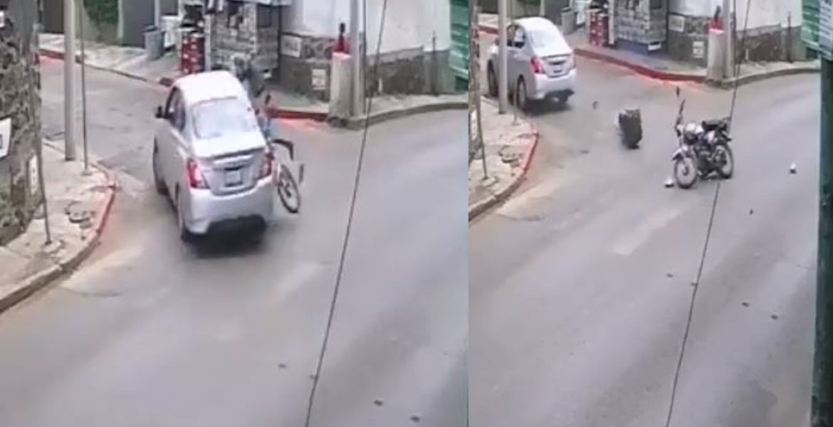 En el video se aprecia cómo un auto Versa dobla hacia Hule, por lo que el motociclista se impacta de lleno, cayendo al pavimento.