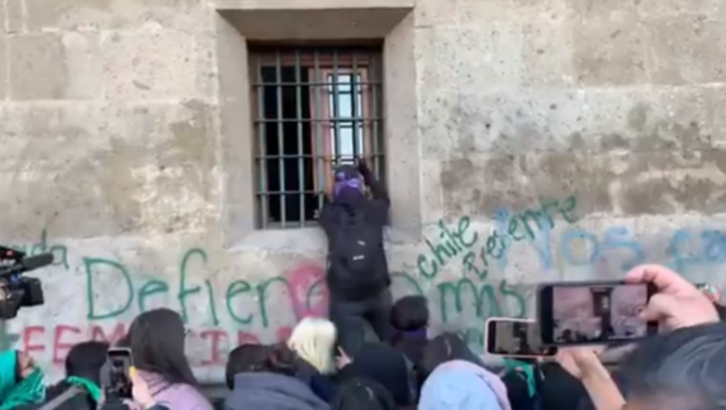 En protesta por los recientes feminicidios de Ingrid Escamilla y la niña Fátima, las inconformes realizan pintas en la banqueta cerca de la puerta Mariana e intentaron encender una fogata.