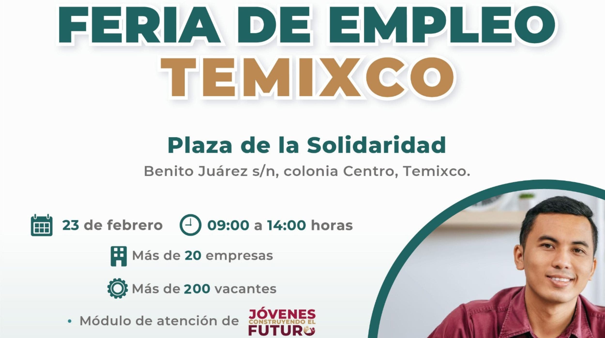 “Los esperamos el día jueves 23 de febrero, a partir de las 09:00 horas, en la ‘Explanada de Plaza de la Solidaridad’, ubicada en calle Benito Juárez sin número, de la colonia centro de Temixco, contaremos con la participación de más de 20 unidades económicas de la zona y más de 200 plazas dirigidas a diversos perfiles laborales”, comentó.