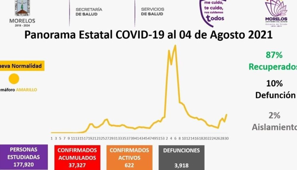 La Secretaría de Salud informa que a la fecha en Morelos se han estudiado 177 mil 920 personas, de las cuales se han confirmado 37 mil 327 con coronavirus COVID-19; 622 están activas y se han registrado 3 mil 918 defunciones.