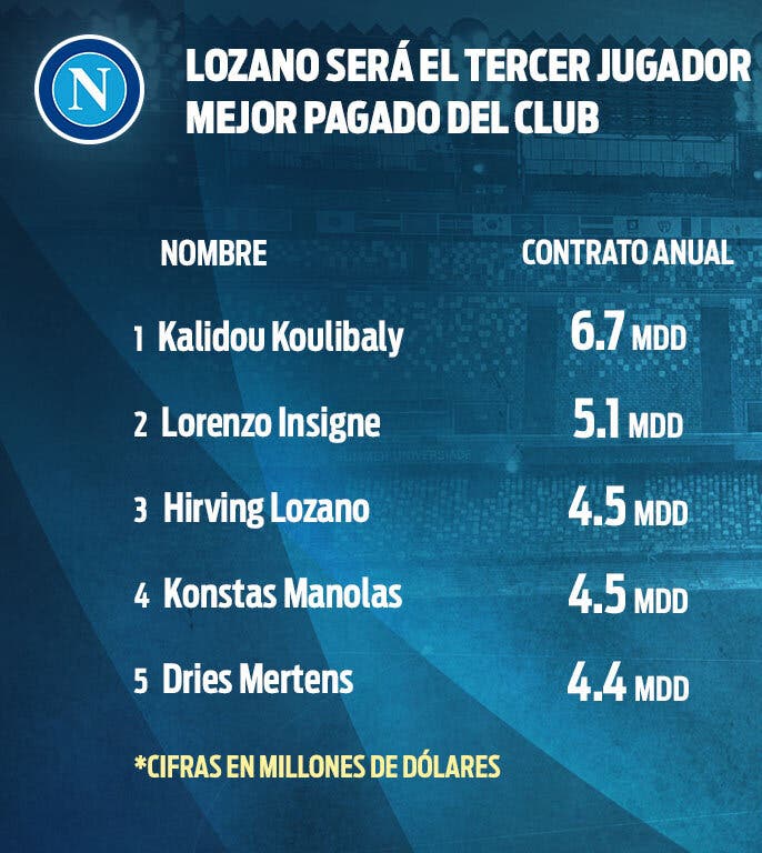 El deseo del Napoli por Lozano ha llevado a ofrecerle una suma anual por sus servicios que solo un selecto grupo de jugadores puede presumir entre la escuadra azzurri. Con una ficha de 4.5 millones de dólares anuales, Lozano será el tercer jugador mejor pagado, sólo por detrás de Kalidou Koulibaly (quien recientemente pasó a cobrar 6.7 mdd anuales) y el capitán y favorito Lorenzo Insigne (5.1 mdd).