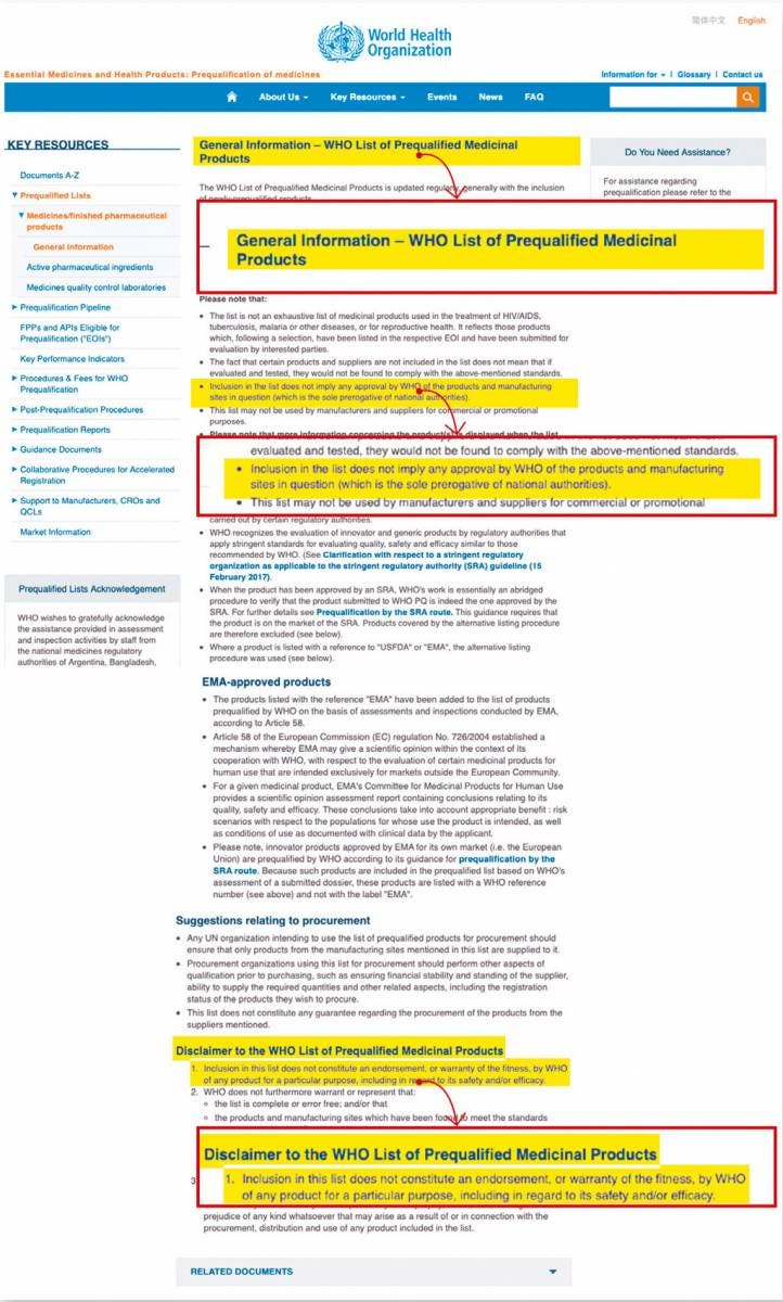 Sin embargo, el documento oficial de la OMS que habla de este listado de medicinas dice claramente: “La inclusión en esta lista no implica ninguna aprobación de la OMS de los productos o sitios de manufactura en cuestión (la cual es prerrogativa única de las autoridades nacionales)”.