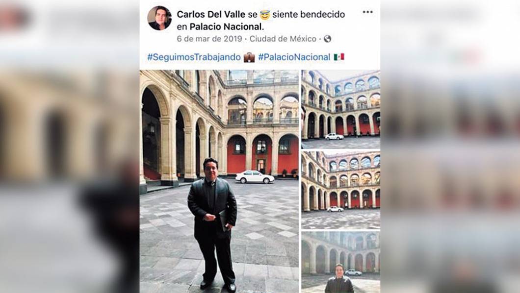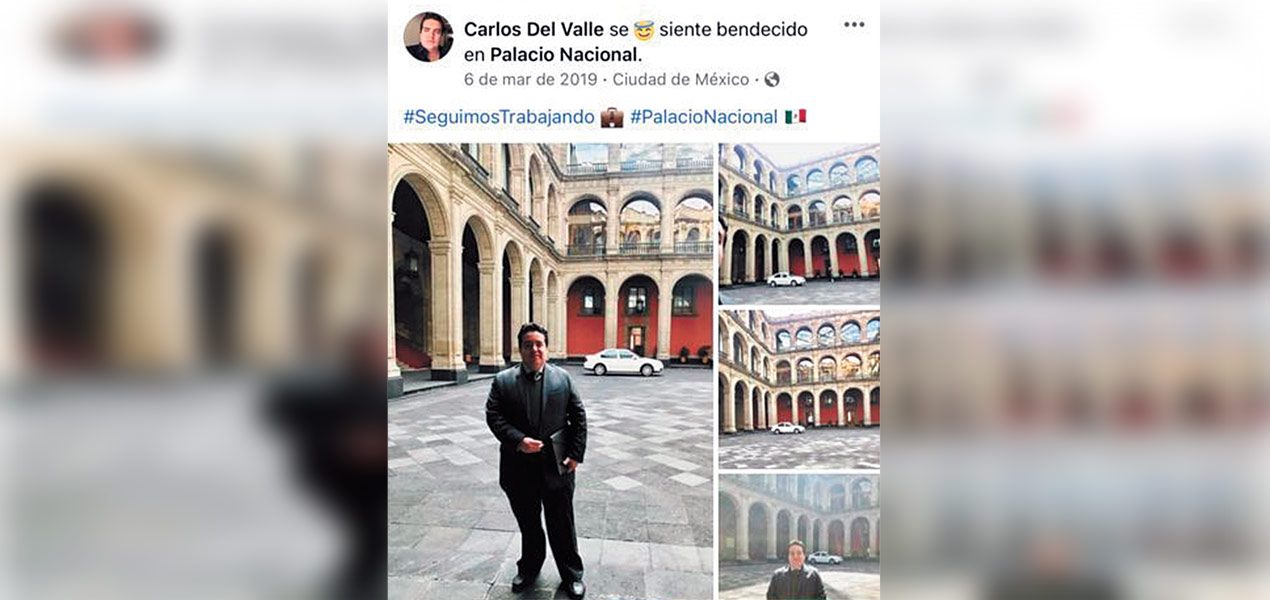 “Carlos Del Valle se siente bendecido en Palacio Nacional”, dice la publicación de Facebook que remata con el hashtag #SeguimosTrabajando y el emoticón de un sonriente angelito. En la foto, de traje, con una carpeta bajo el brazo, Del Valle posa en el patio central de Palacio, con el coche del presidente atrás. Es de marzo de 2019.