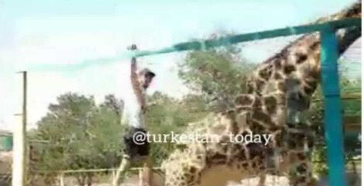 Un hombre en aparente estado de ebriedad se montó al lomo de una jirafa en el zoológico de la ciudad de Shymkent, en Kazajistán.