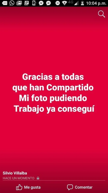 Fue el 02 de diciembre del 2018, cuando Silvio Villalba decidió compartió en su cuenta de Facebook una foto cargando un letrero con el mensaje: “Busco trabajo, no aguanto más, págueme lo que quieran. Me ofrezco 12 horas diarias”, en la imagen se puede ver al hombre con cara de angustia.
