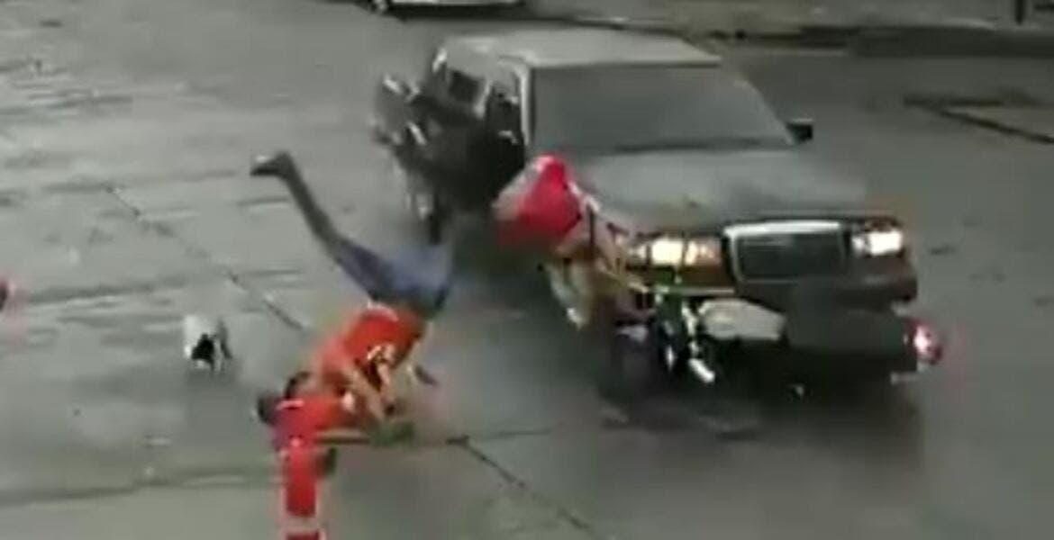 En un video se puede ver que la conductora de un vehículo Lincoln modelo 1980 no respetó el alto y embistió a la familia, provocando que un menor, una mujer embarazada y un hombre salieran proyectados y se impactaran contra el concreto.