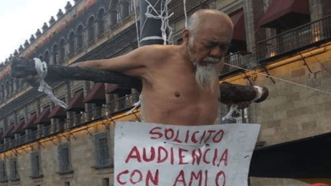 CDMX.- Un hombre de 78 años de edad se "crucifica" frente al Palacio Nacional, en el Zócalo de la Ciudad de México, de manera de protesta por la muerte de su esposa y el despojo de sus tierras en Tuxtepec, Oaxaca exigiendo hablar con el presidente Andrés Manuel López Obrador (AMLO).