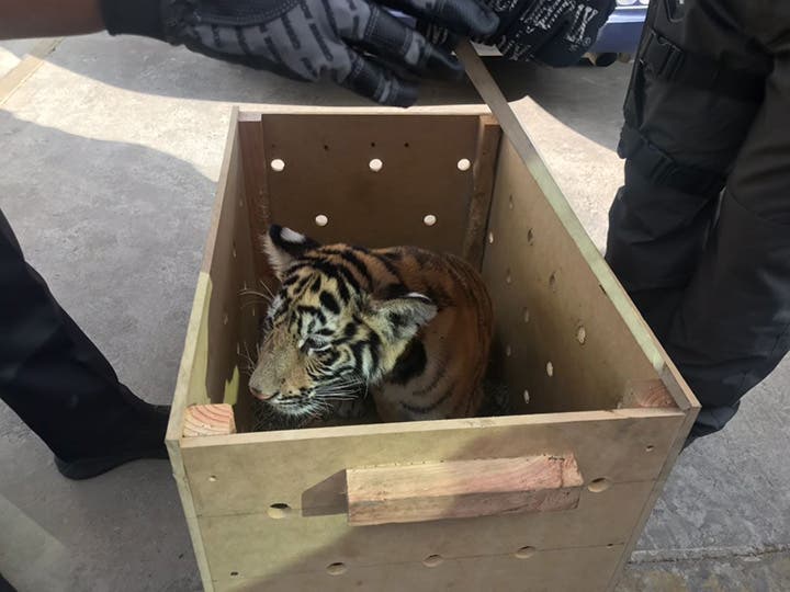 Elementos de la Policía Federal localizaron a las afueras del área de mensajería y paquetería del Aeropuerto Internacional Xoxocotlán, Oaxaca, a un ejemplar hembra de tigre de bengala que había sido comprada por Internet.