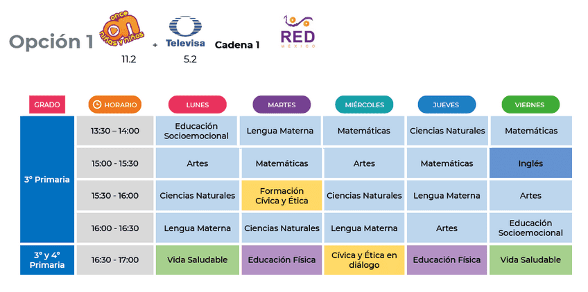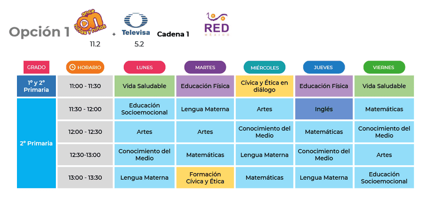 Para primero de primaria, las clases estarán disponibles en los siguientes horarios: