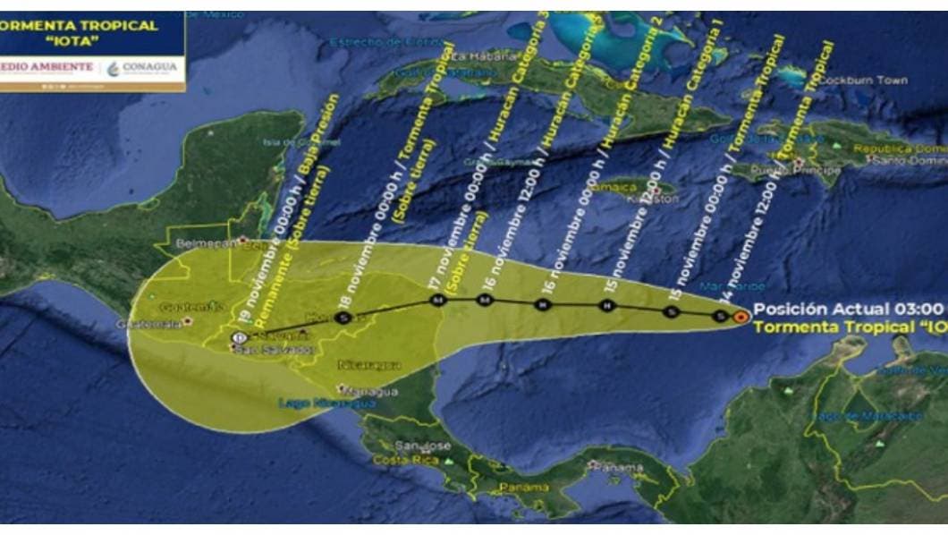Iota podría tocar tierra este lunes por la noche en el litoral caribeño entre Nicaragua y Honduras, siguiendo un rumbo similar al de Eta, que a inicios de este mes dejó más de 200 muertos y 2.5 millones de afectados por inundaciones y deslaves.